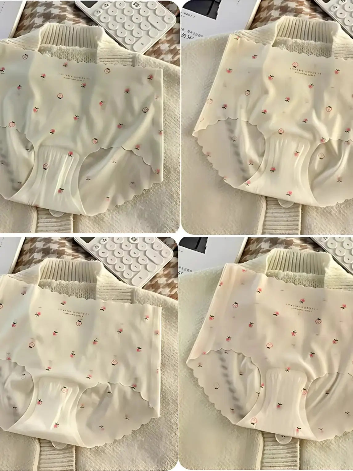 Designed in a soft pastel tone with cute peach and floral motifs, these panties combine comfort with adorable style. The seamless design ensures a smooth fit under clothing, while the scalloped waistband adds a feminine, delicate detail.