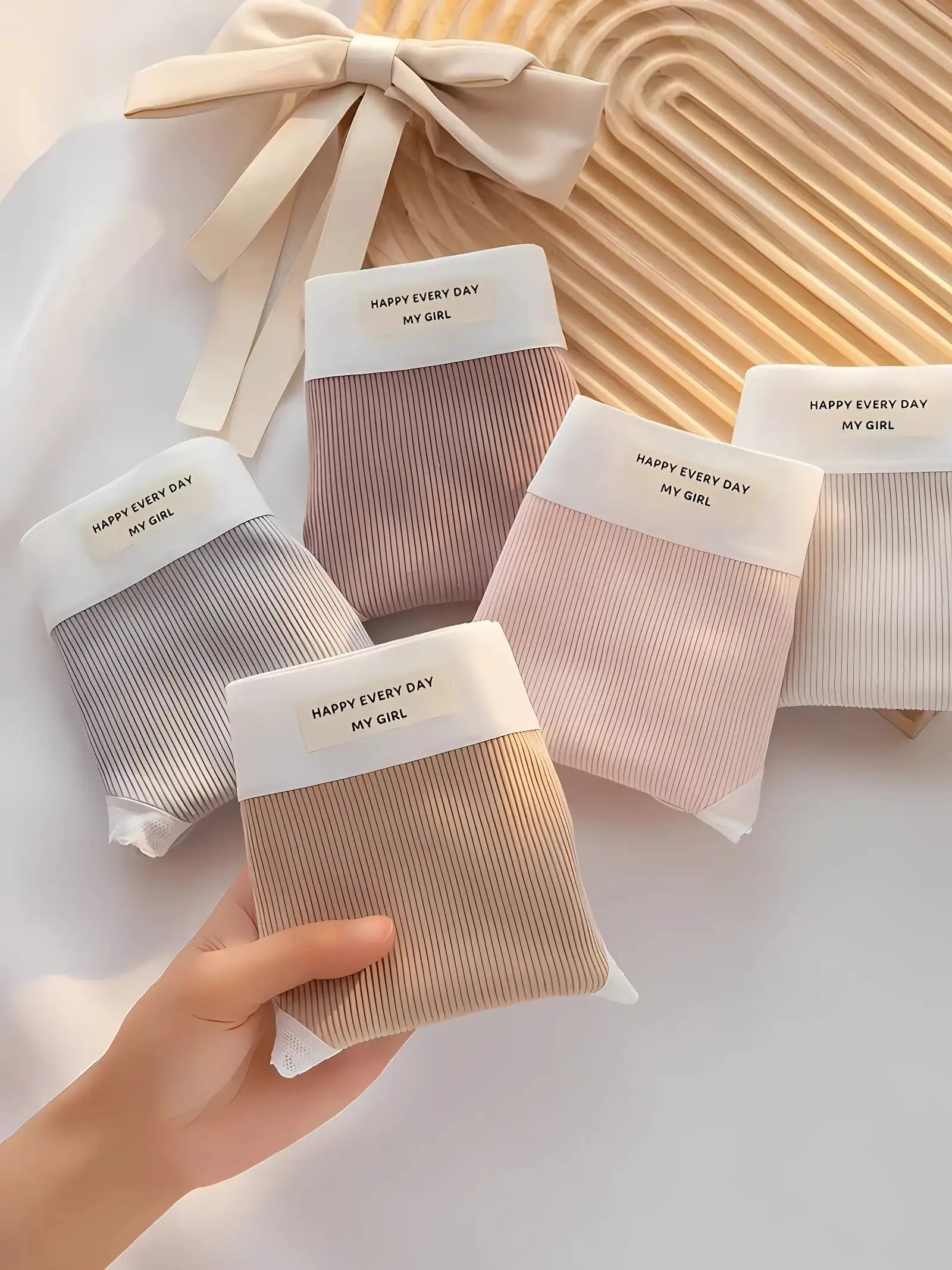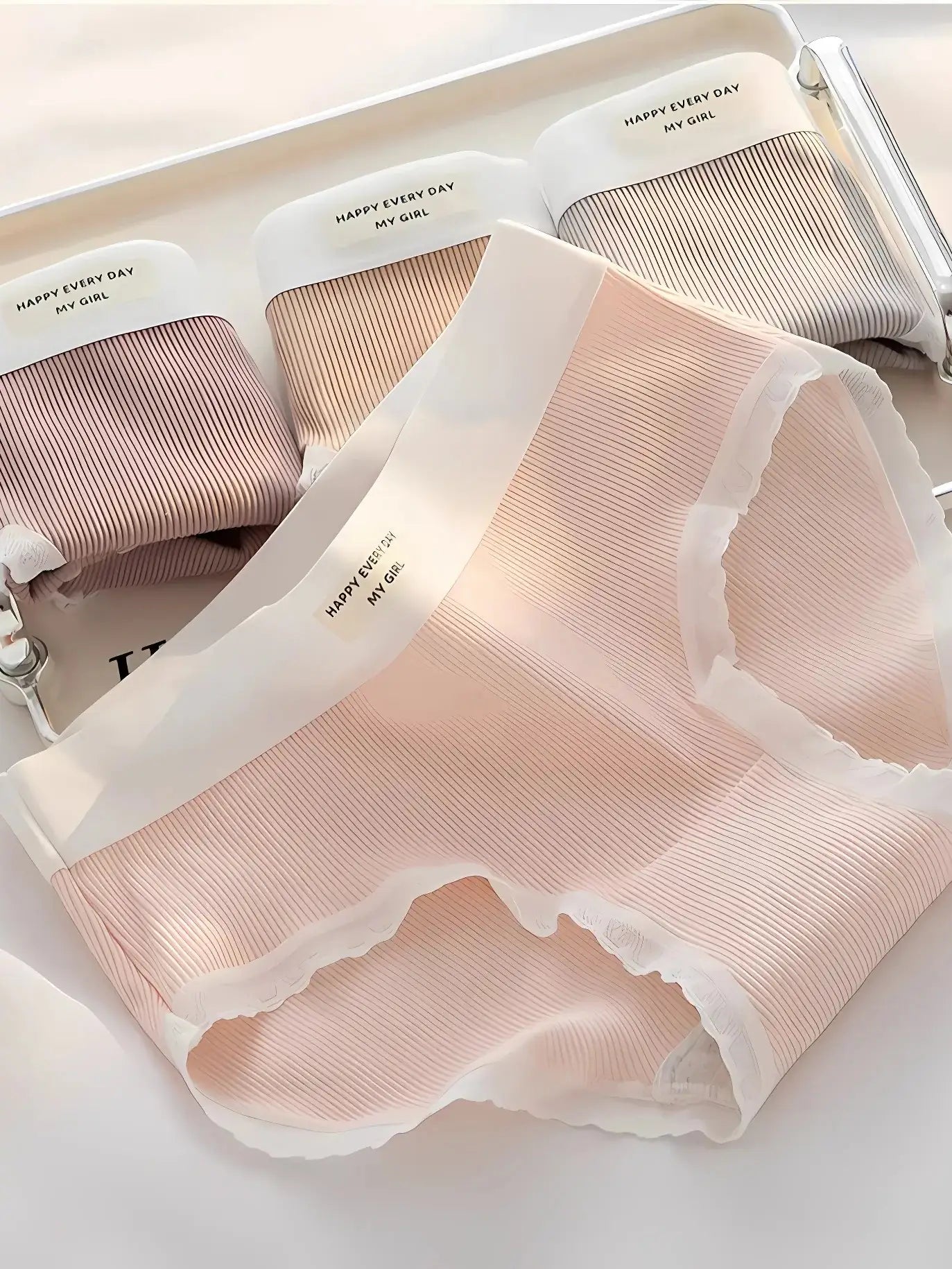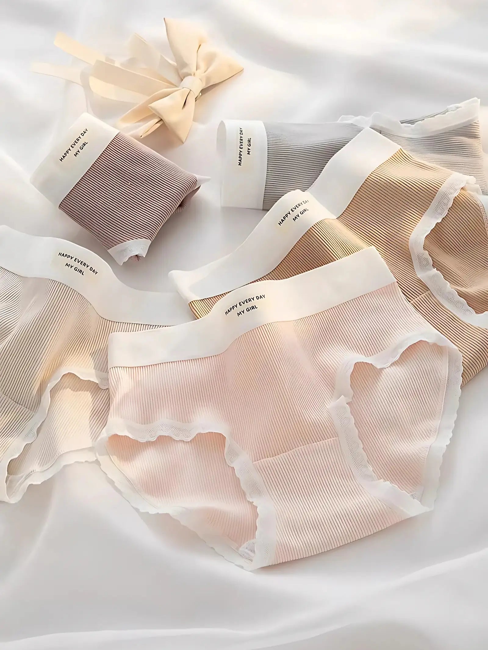 Each piece features a wide, soft waistband printed with the sweet message “HAPPY EVERY DAY MY GIRL” and is finished with delicate lace trims that add a charming, feminine touch. The breathable material and snug fit offer full coverage without sacrificing style.